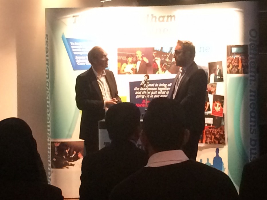 AWC Windows & Home Improvements Managing Director Michael Griffiths on stage at the launch of the Oldham Business Awards 2016 asking questions about winning the award for Retailer of the Year 2015.